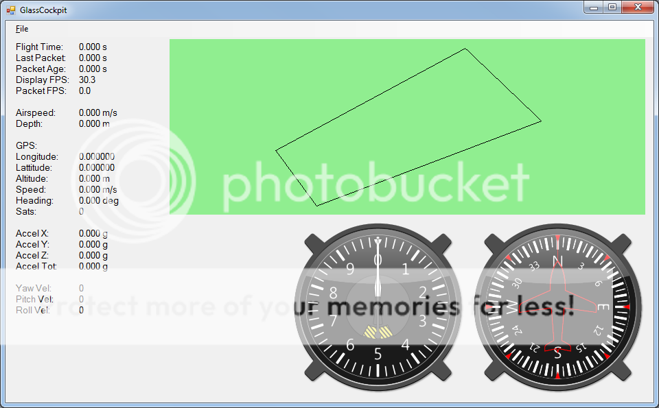 The bulk of the last couple weeks has been spent working on software. The screenshots here are from the latest version of our homemade cockpit app. This runs on my laptop when we're flying and displays telemetry from the plane in real time. It can also save logs of the flights and plays them back later. The newest additions feature-wise are the Altimeter and the Heading Indicator instruments that show up on the bottom-right. If you're wondering, the units on the Altimeter are 1000/100/10 meters.